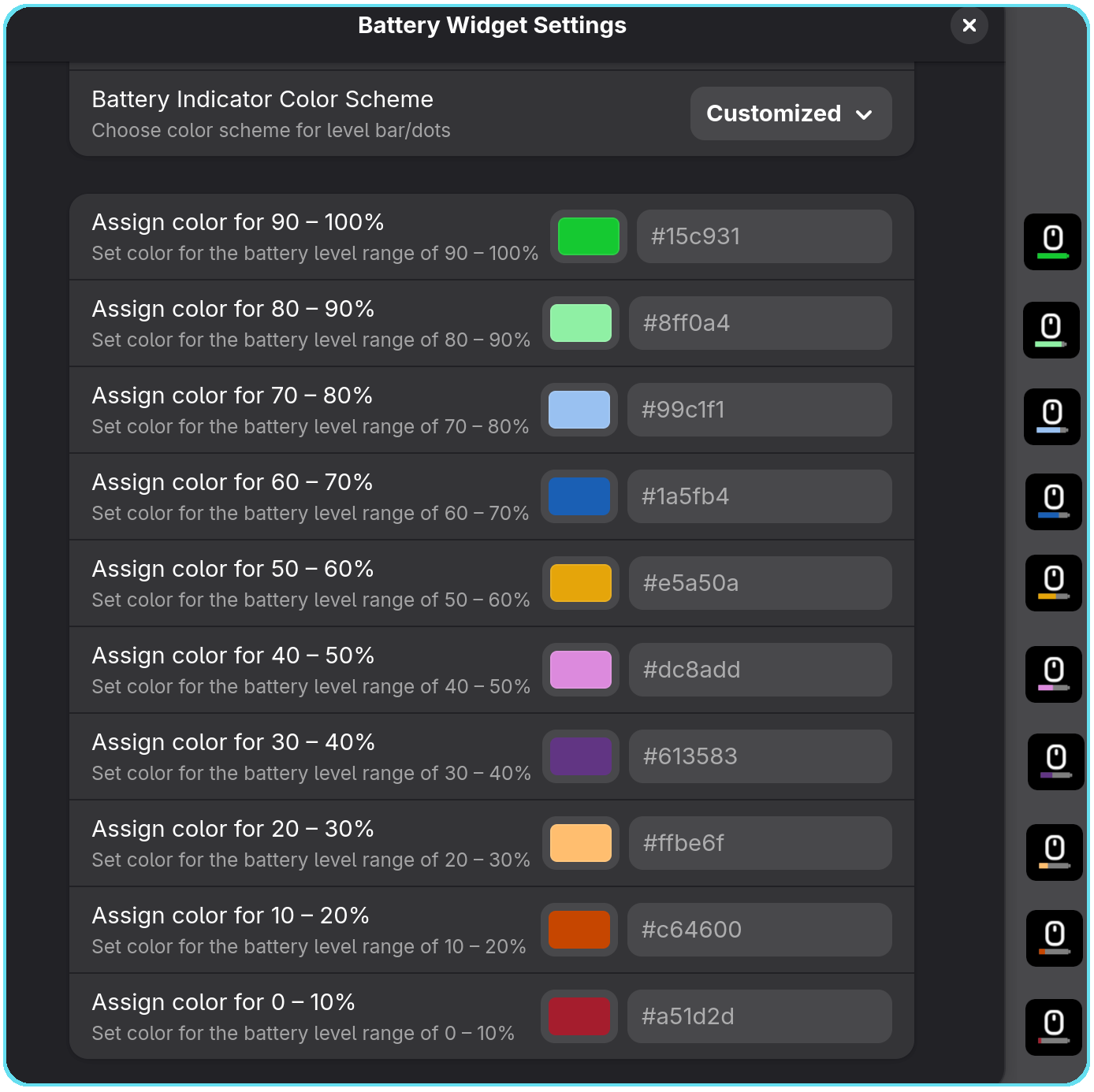 - Customize: Allows you to define custom colors for different battery level ranges.