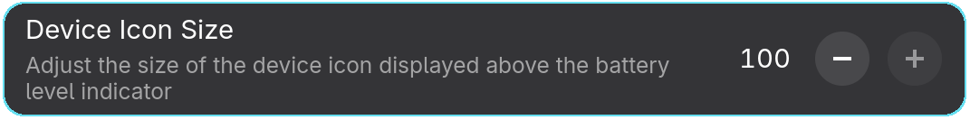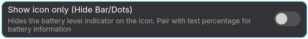 Enabled: When enabled, the extension hides the battery level visualization (bar or dots) and displays only the Bluetooth device icon. This mode is best used together with the “Display battery percentage as text” option for a cleaner, minimal look while still retaining key battery information.