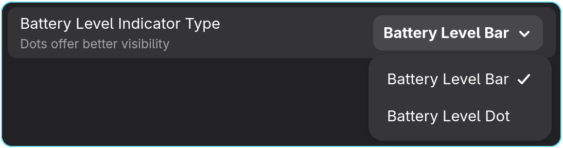 - Battery Level Dots: displays dots representing level of battery.
